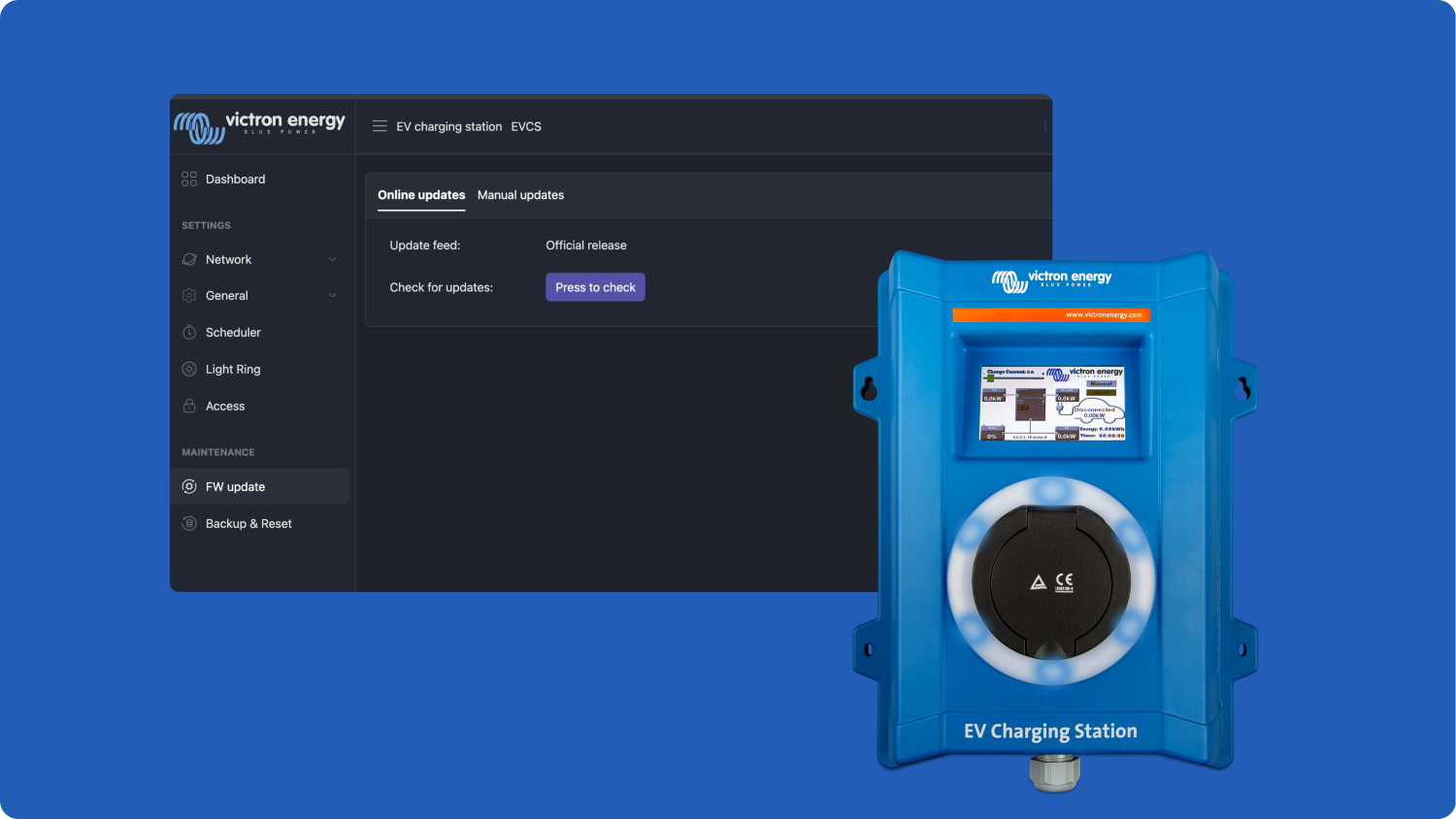 The EVCS firmware can be updated manually via the web interface or remotely via VRM: Remote firmware update.